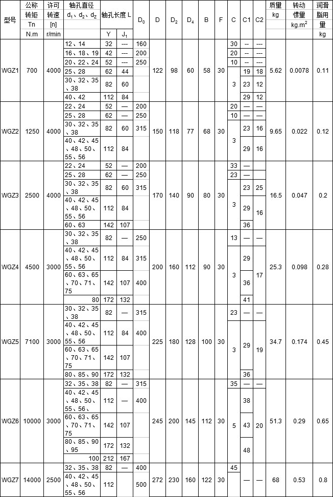 WGT型--接中间套型,适用于两轴长距离联接,许用转速[n]取决于中间套的长度和质量,并应验算临界转速;