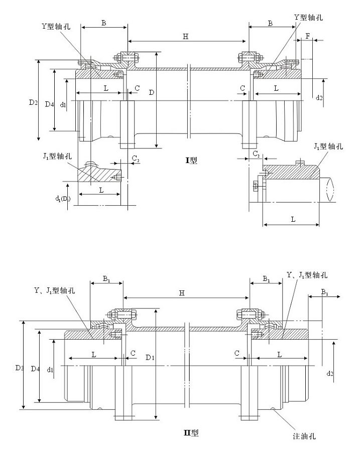 II型--密封端盖为整体型,齿间距小,相对允许径向位移小,结构紧凑,转动惯量小,可与Y、J1型轴伸联接;